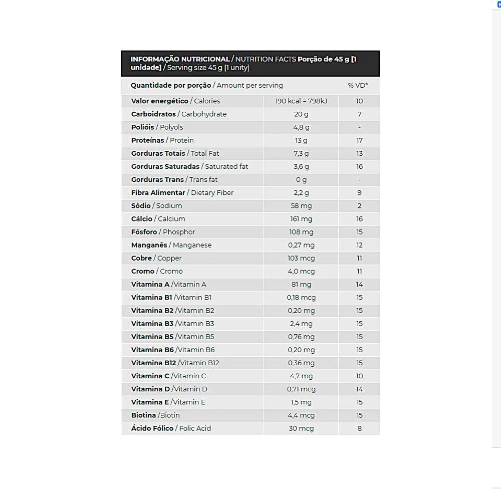 | Mezcla de proteínas [concentrado de proteína de leche, aislado de proteína de suero, proteína hidrolizada (colágeno) y concentrado de proteína de suero], relleno de crema de avellanas de cacao, recubrimiento de chocolate con leche, jarabe de maltitol, jarabe de fructosa, aceite de palma, fructo-oligosacáridos, cacao en polvo, aislado de soja crujiente, mezcla vitamínica [vitamina A (palmitato de retinilo), Vitamina D (colecalciferol), vitamina E (acetato de tocoferilo), vitamina C (ácido ascórbico), vitamina B1 (mononitrato de tiamina), vitamina B2 (riboflavina), vitamina B6 (piridoxina), vitamina B12 (cianocobalamina), vitamina H (biotina), vitamina PP (nicotinamida), ácido fólico y vitamina B5 (pantotenato de calcio), mezcla de minerales (sulfato de manganeso, sulfato de cromo y cobre), cloruro sódico, glicerina (humecante), sabor natural idéntico, lecitina de soja (emulsionante) y sorbato de potasio (conservante). |
