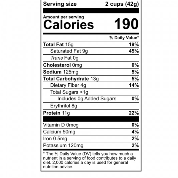 Aislado de proteína de suero, eritritol, chocolate sin azúcar, manteca de cacao, maní, aceite de palma, fibra de maíz soluble, caseinato de sodio. Contiene menos del 2% de lo siguiente: Lecitina de girasol, sal marina, grasa de mantequilla, sabor natural, aceite de maní, sucralosa.