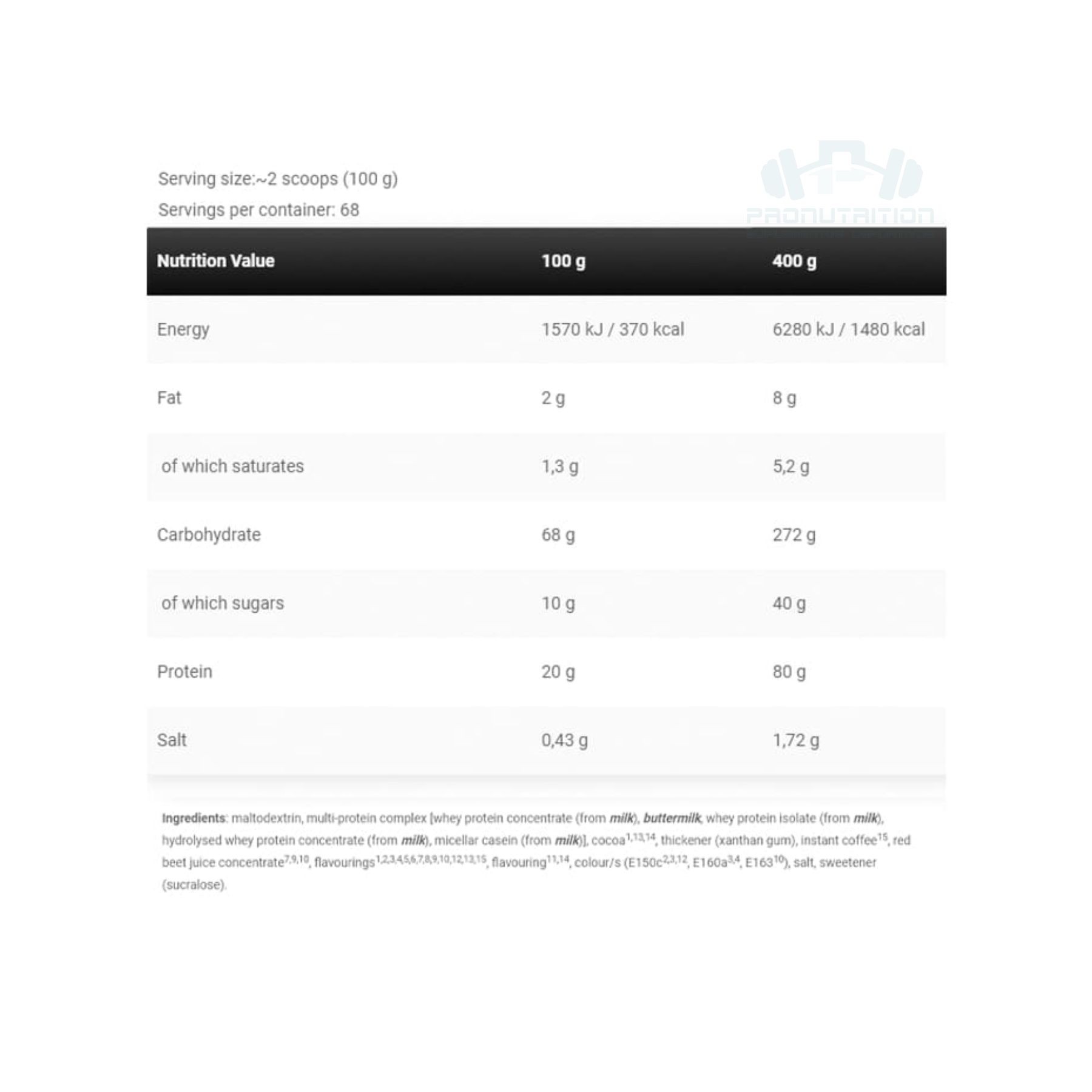 La composición de LEVRO LEGENDARY MASS es una estudiada composición de hasta 5 formas de proteínas completas con hidratos de carbono de cadena media. El producto es una opción ideal para las personas físicamente activas, los aficionados y los profesionales que buscan una forma rápida de suministrar a su dieta diaria macronutrientes esenciales y una sólida porción de calorías. La fórmula tiene una solubilidad impecable, y la pequeña cantidad de azúcar no afecta a la exquisitez de los sabores que se ofrecen. Se trata de una solución excelente para los deportistas que entrenan intensamente y cuyo plan de nutrición se basa en dietas altas en calorías. Se recomienda el uso de Gainer con otros suplementos, como los suplementos de preentrenamiento, la creatina y los complejos de aminoácidos.