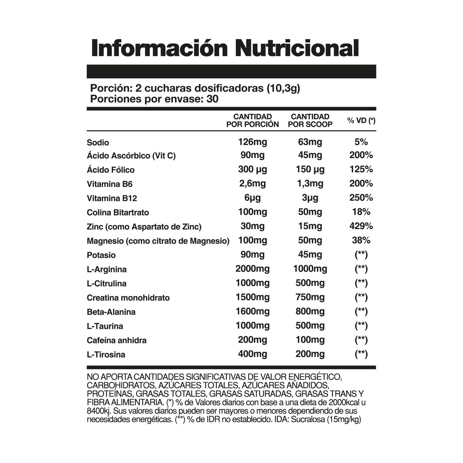 USO SUGERIDO: Para determinar tolerancia, comience tomando 1 scoop mezclado con 100 ml de agua fría. Después de evaluar tolerancia personal, tomar 2 scoop mezclado con 200-300 ml de agua fría. 30 minutos antes del entrenamiento.