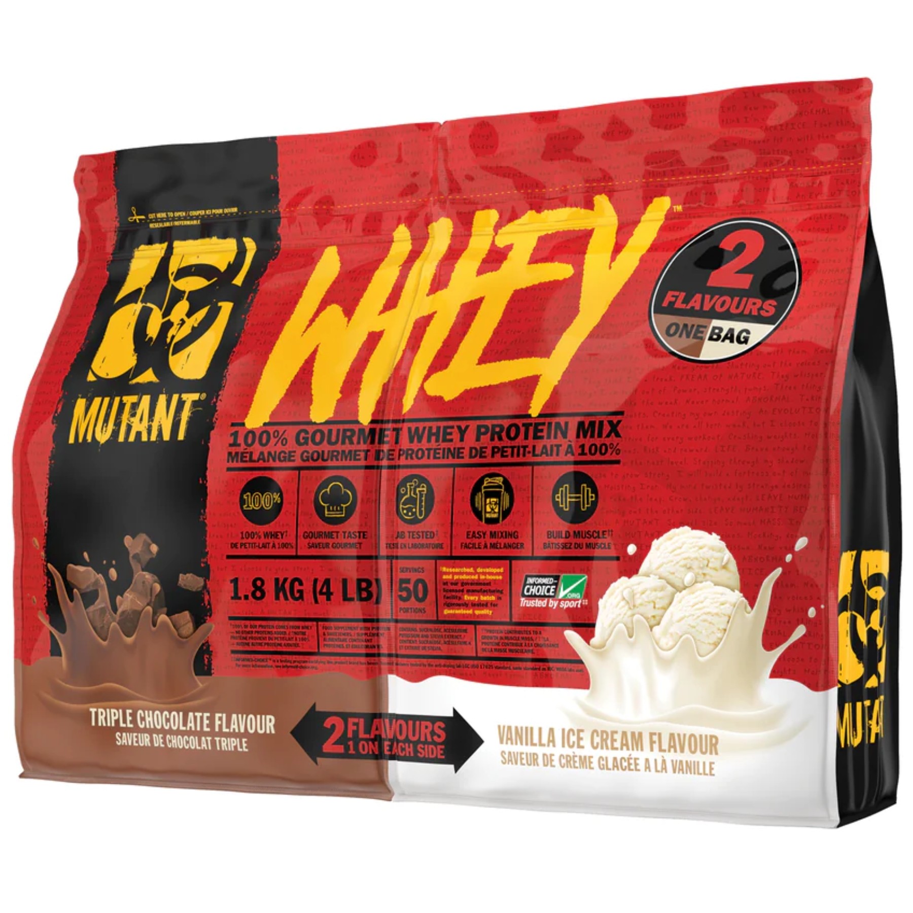 El Mutant Whey Dual 4lb ofrece una experiencia única al combinar dos sabores gourmet en una sola bolsa, permitiéndote variar tu consumo sin sacrificar calidad ni sabor. Cada porción proporciona: